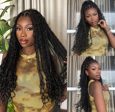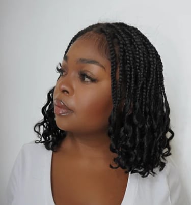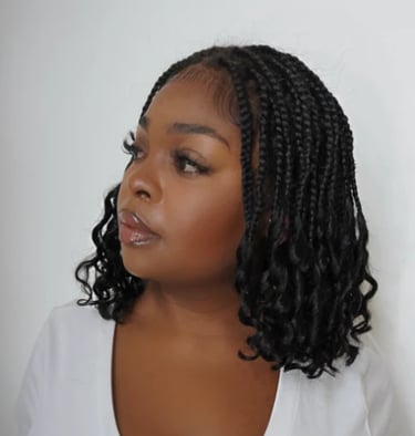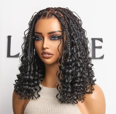 A HD full lace knotless boho curls braided bob wig. A pre-cut lace wig for flexi fit with a invisi drawstring cap